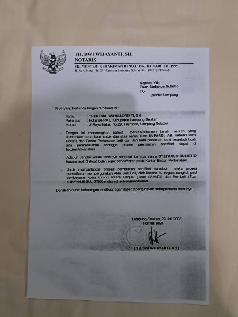 Notaris bahkan menerbitkan cover note yang menyatakan tanah tersebut dalam kondisi bersih dari sengketa (clean and clear) berdasarkan pengecekan di BPN.