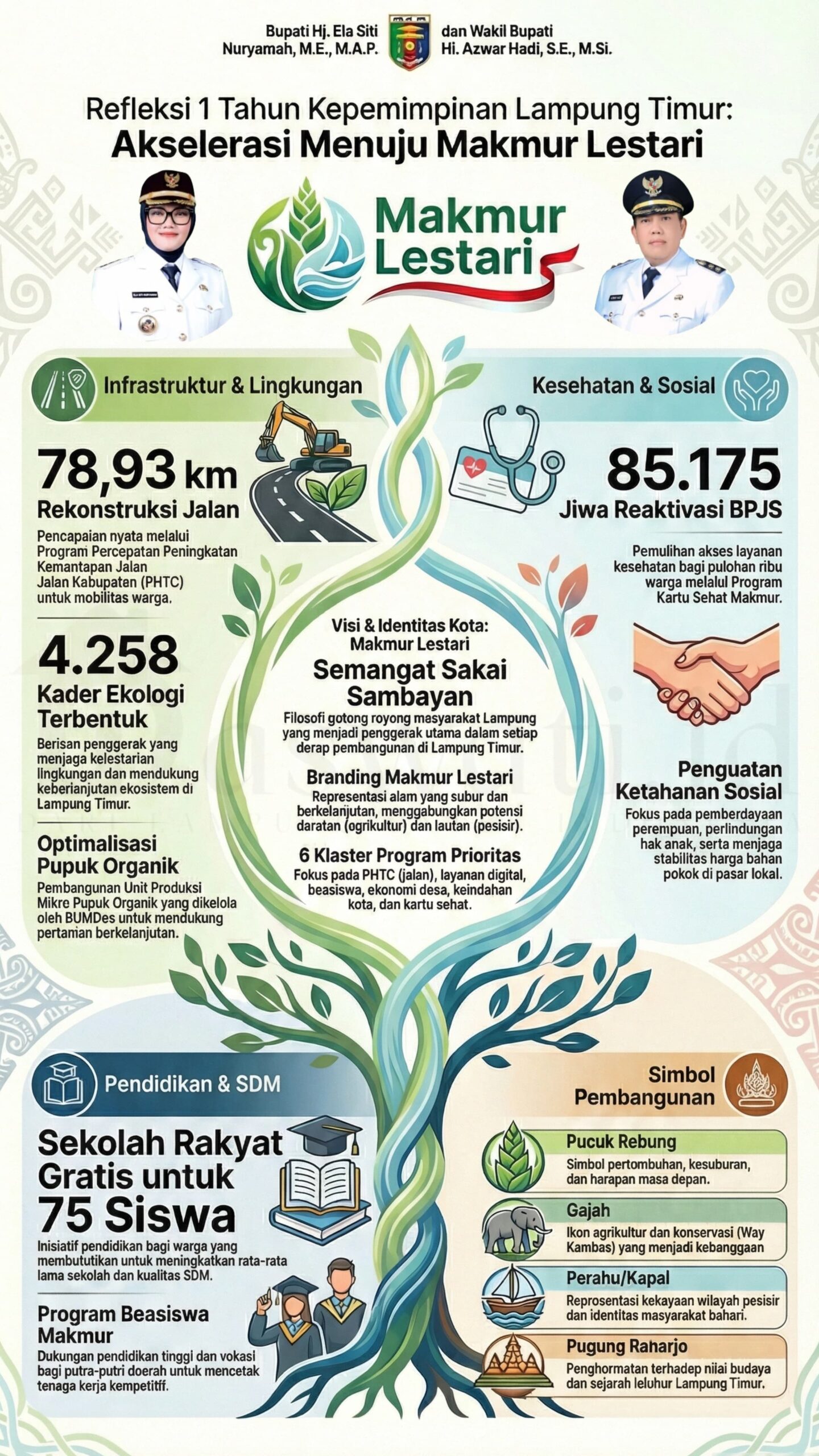 Mengusung visi “Lampung Timur Makmur Menuju Indonesia Emas”, kepemimpinan ini tidak hanya bekerja di balik meja, tetapi terjun langsung melakukan akselerasi pembangunan melalui semangat Sakai Sambayan.